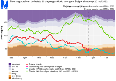 Voorbije lentemaanden waren droog, zelfs uiterst droog. Met 2,2 mm neerslag was de maand maart de droogste maand maart in Ukkel sinds het begin van de metingen in 1833. Zoals zichtbaar op de onderstaande figuur met de dagelijkse neerslag in Ukkel sinds 1 maart 2022, was de maand april iets natter (37,4 mm) en viel er tijdens het grootste deel van de maand mei geen neerslag (29,5 mm t.e.m. 19 mei, waarvan maar liefst 28,5 mm op 19 mei viel tijdens een onweer). Hiermee staat tot nu toe het neerslagtotaal voor de lente in Ukkel (1 maart t.e.m. 19 mei) op 69 mm, wat momenteel samen met 1976 het tweede laagste neerslagtotaal voor de lente is sinds het begin van de metingen en ruim onder de normaalwaarde van 165,6 mm ligt (voor de periode 1991-2020). Zelfs tijdens de recente droge lente van 2020 (105,7 mm) viel er meer neerslag in Ukkel.