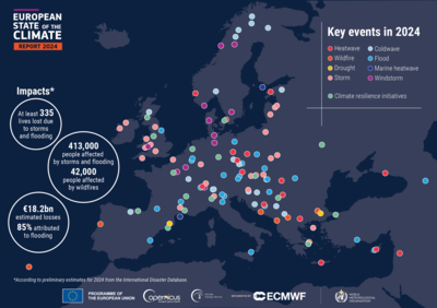 • Temperatuur: 2024 was het warmste jaar voor Europa, met recordhoge jaartemperaturen in bijna de helft van het continent.