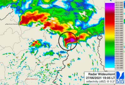 De radarecho's van onze radar in Wideumont toonden op 27 juni de typische structuur ("hook echo") die kenmerkend is voor mesocyclonen (zie figuur 1). Daarnaast kunnen we op de Dopplerbeelden (figuur 2) ook aanwijzingen vinden voor het roterende systeem dat de aanleiding kan geven voor de vorming van een tornado.