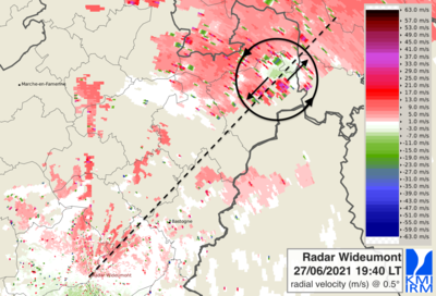 Belangrijk bij de interpretatie van de Dopplerbeelden is dat een weerradar enkel de beweging kan detecteren naar de radar toe of van de radar weg. Men spreekt daarom van radiale snelheid. Op de figuur 2 is dit aangeduid met een groene (naar de radar toe) en rode (van de radar weg) kleur. De Dopplerbeelden zijn in deze dynamische situaties zeer complex en vaak ook vrij ruizig, waardoor eenduidige conclusies niet altijd mogelijk zijn. Toch is er op de radarbeelden van 27/06 (tornado Houffalize) een draaiende structuur waar te nemen. Deze was niet zo duidelijk op het moment van de tornado zelf (rond 19u), maar wel een beetje later in de verdere evolutie van de cel (19u40, figuur 2).