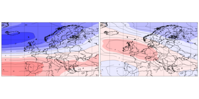 Afwijking (in decameter) van het gemiddeld 500 hPa geopotentiaal (hoogte waar de luchtdruk 500 hPa bedraagt). Rode gebieden duiden op meer hogedruk dan gewoonlijk; blauwe gebieden net andersom. Links: geldend voor de natte periode februari – 15 maart. Rechts: voor de droge periode 15 maart – 20 mei. Bron data: ECMWF.