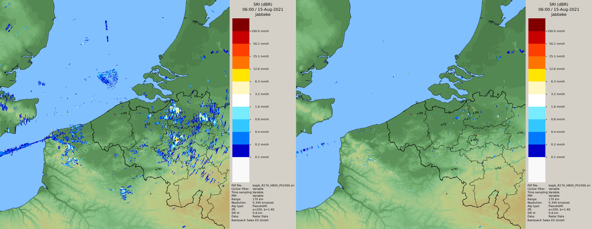 Links: het ongefilterde neerslagbeeld van de radar van Jabbeke op 15/08/2021 om 06u00 universele tijd. Het gaat om een situatie zonder neerslag en alle signalen op dit beeld zijn dus niet-meteorologisch. Rechts: hetzelfde beeld maar dan gefilterd aan de hand van de dubbele polarisatiegegevens.