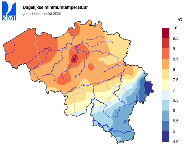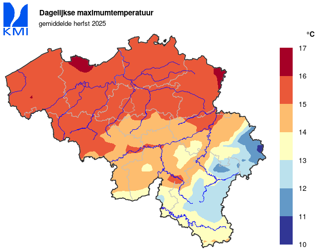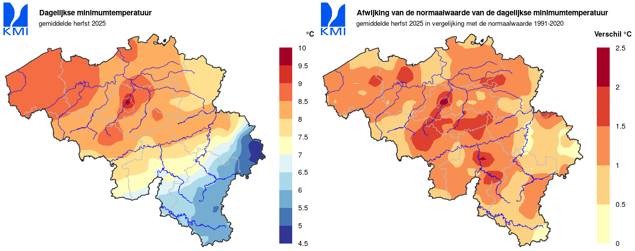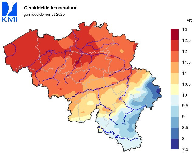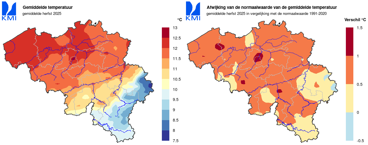 De herfst van 2025 was warmer dan normaal met een gemiddelde temperatuur van 12,0°C (normaal: 11,2°C).