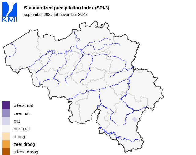 De gemiddelde regionale neerslaghoeveelheden in ons land varieerden van ongeveer 85% van de normale aan de kust en in de Polders tot ongeveer 115% van de normale in de Ardennen.