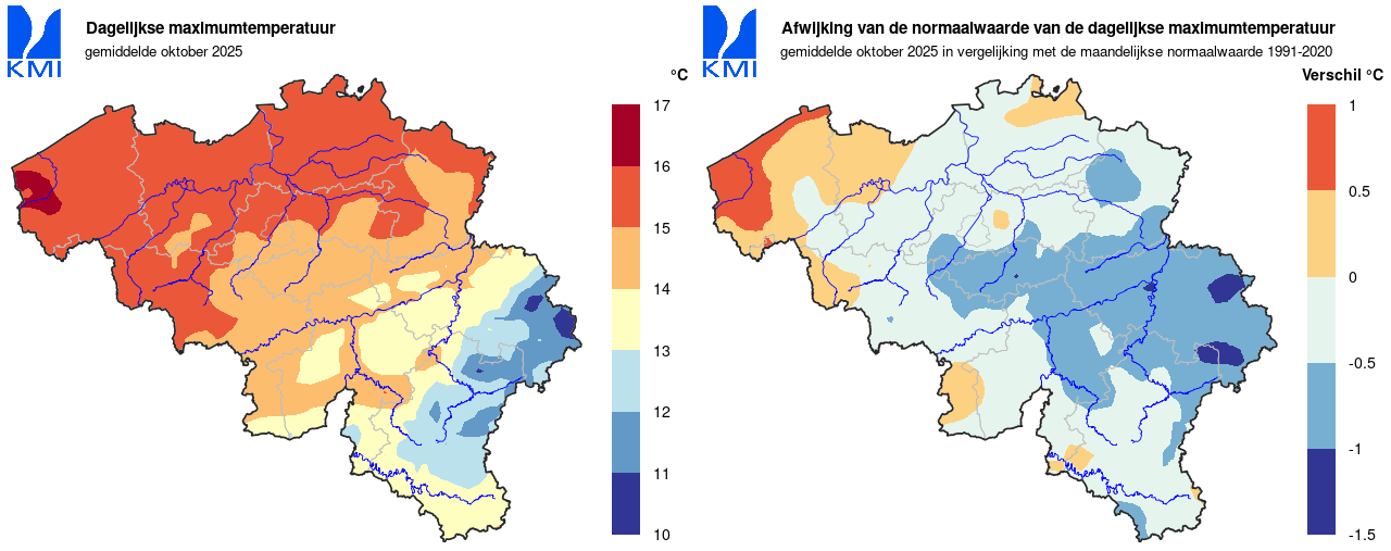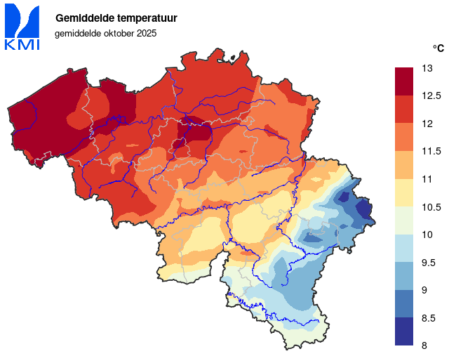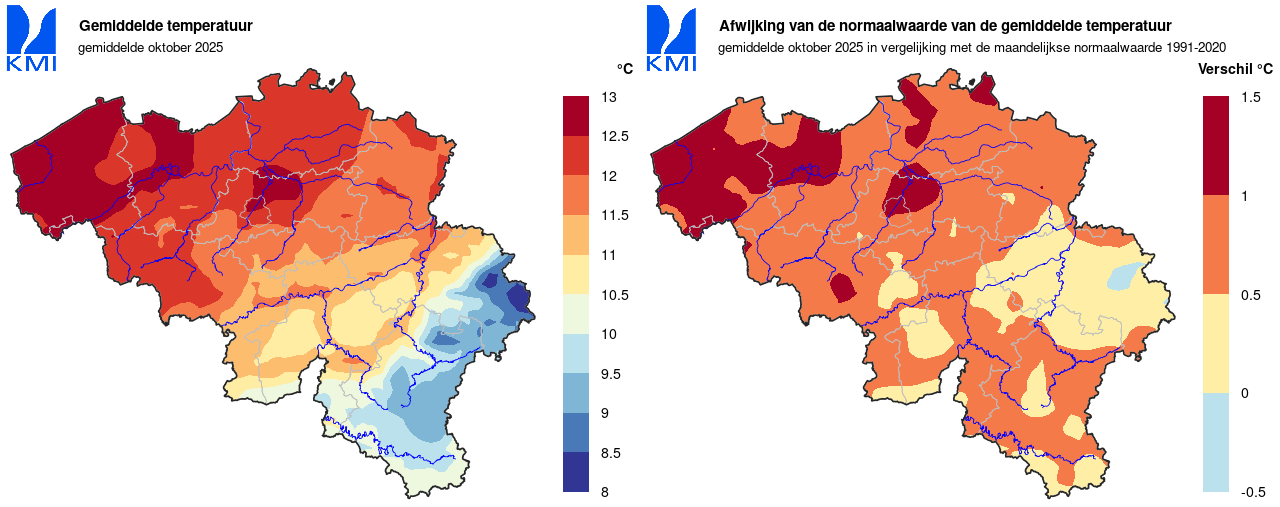 In Ukkel bedroeg de gemiddelde temperatuur van de maand oktober 12,0°C (normaal: 11,3°C). De gemiddelde temperaturen lagen er het grootste deel van de maand boven hun respectievelijke normalen. Enkel aan het begin van de maand en van 24 tot 27 oktober was het iets kouder dan normaal.