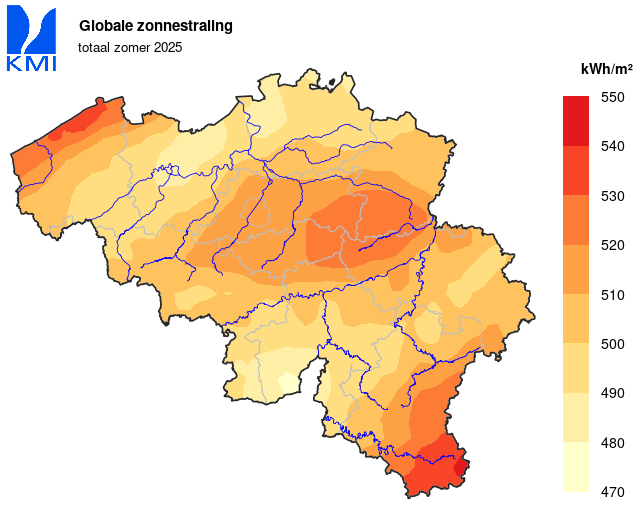 | Globale zonnestraling | kWh/m² | 510.8 | 442.6 | +++ | 498.2 | 2018 | 393.1 | 2007 |