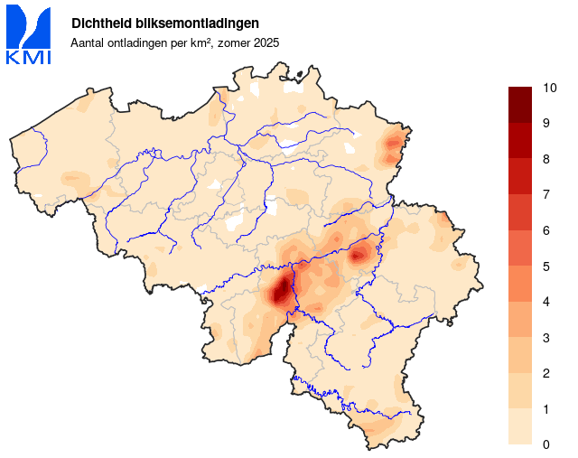 Deze zomer werden er in het officiële anemometrische meetnet in ons land geen windstoten van minstens 100 km/u (28 m/s) gemeten. Deze snelheden konden wel lokaal bereikt worden tijdens de onweders.