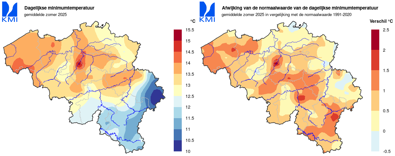 Met een waarde van 24,3°C, was de gemiddelde maximumtemperatuur hier ook een pak hoger dan de normale waarde (22,5°C). Deze waarde landt op een vierde plaats voor de huidige referentieperiode (na 2022, 2018 en 2003). Ook de gemiddelde minimumtemperatuur (14,2°C) lag boven de normale waarde (13,4°C). Dit is de derde hoogste waarde sinds het begin van de waarnemingen in 1892 (na 2018 en 2003).