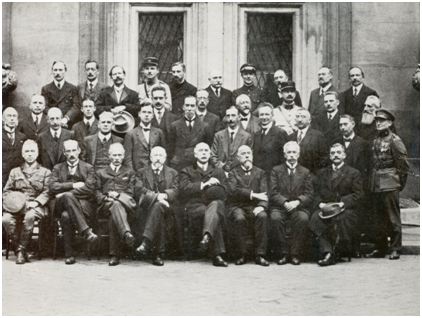 De deelnemers aan de Internationale Meteorologische Conferentie gehouden te Parijs in 1919. Jules Jaumotte staat uiterst rechts in Belgisch militair uniform met zijn onderscheidingen. Fernand Jacobs bevindt zich in de derde rij, tweede rechts.