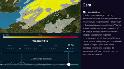 Selecteer met uw afstandsbediening het radarbeeld en bekijk de realtime neerslaggebieden en hun bewegingen in de komende uren, zonder onze waarschuwingen te vergeten!