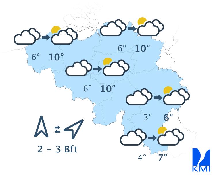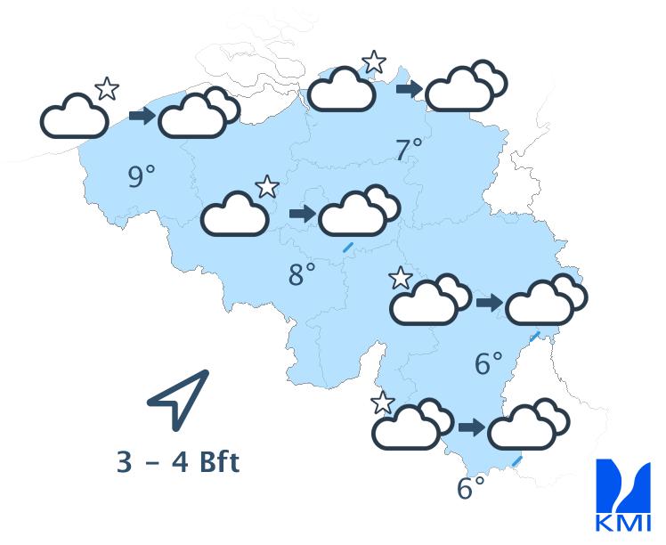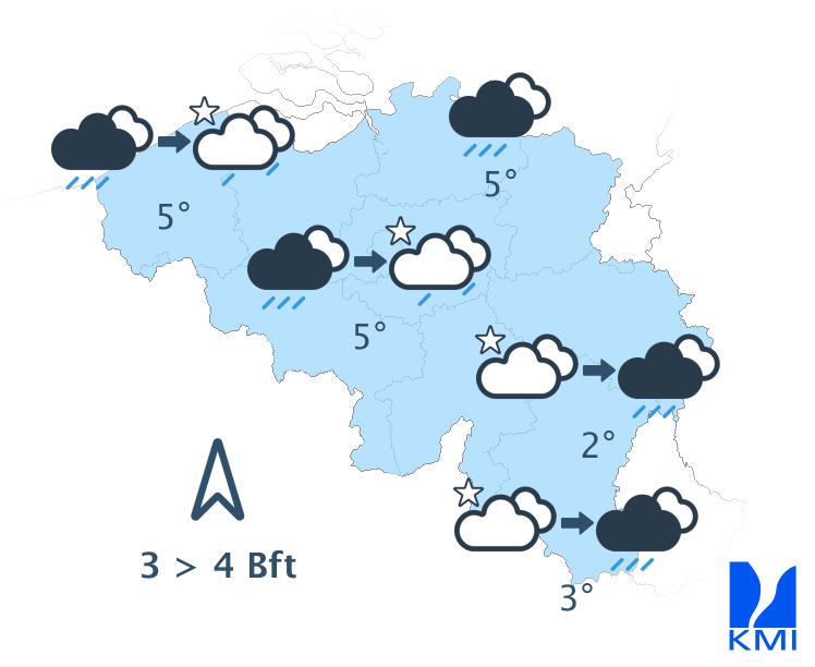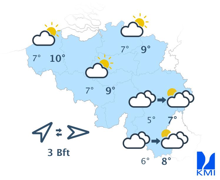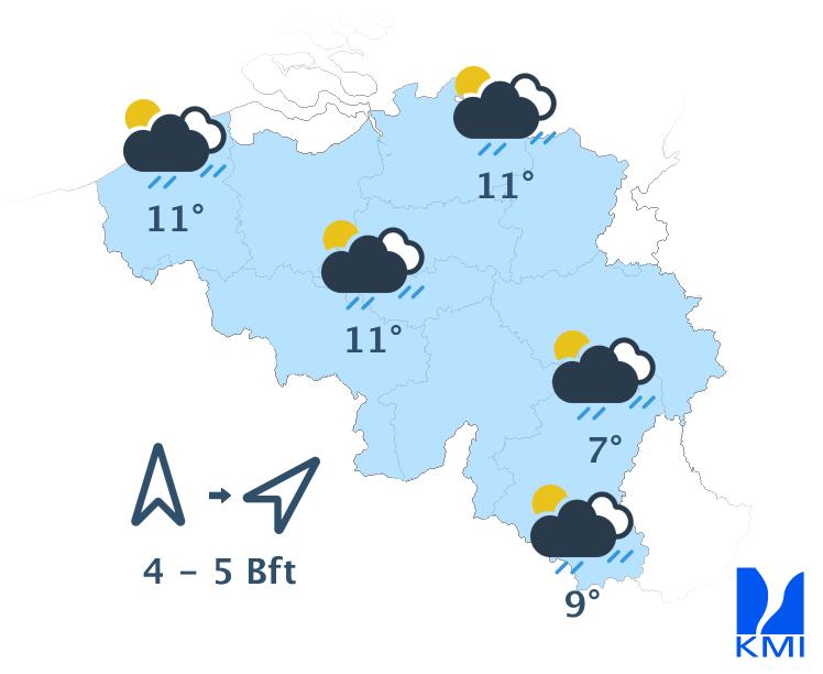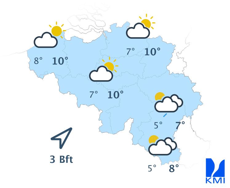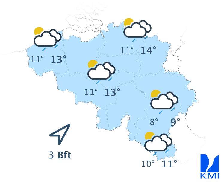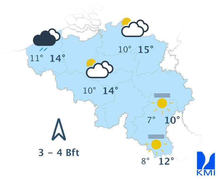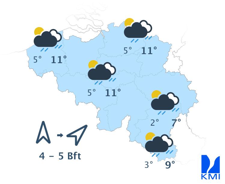 Morgen is het wisselend tot meestal zwaarbewolkt met soms wat regen of een bui. In de namiddag kan het vooral in de noordwestelijke landshelft harder gaan regen. Het wordt zeer zacht met maxima van 10 tot 12 graden in de Ardennen en rond 13 à 14 graden elders. De wind waait matig en aan zee eerder vrij krachtig uit zuid tot zuidwest met rukwinden tot 50 km/h.