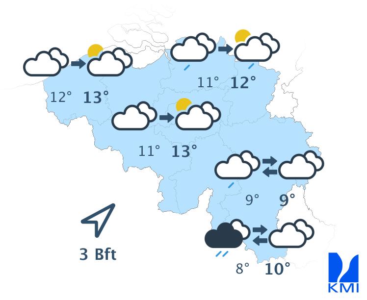 Woensdagochtend is het zwaarbewolkt en sleept een regenzone nog tijdelijk over de zuidoostelijke landshelft. Later wordt het eerder wisselvallig met opklaringen over het westelijk deel van het land. Over het oosten en het zuidoosten blijft het zwaarbewolkt met kans op neerslag. De maxima liggen tussen 9 en 13 graden bij een matige en aan zee eerder vrij krachtige zuidwestelijke wind.