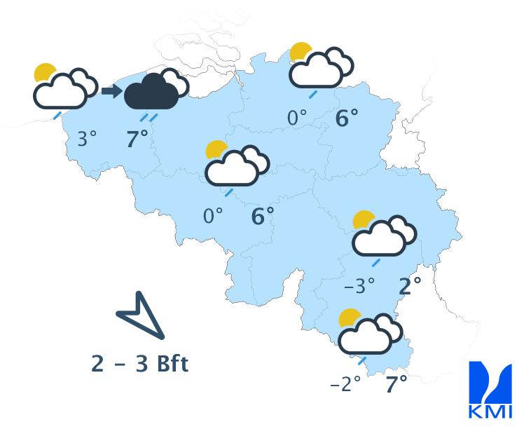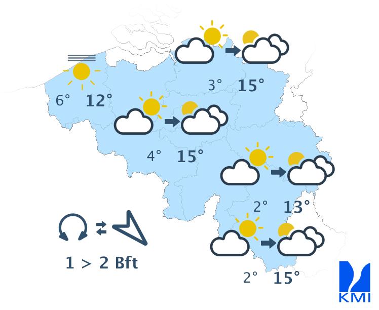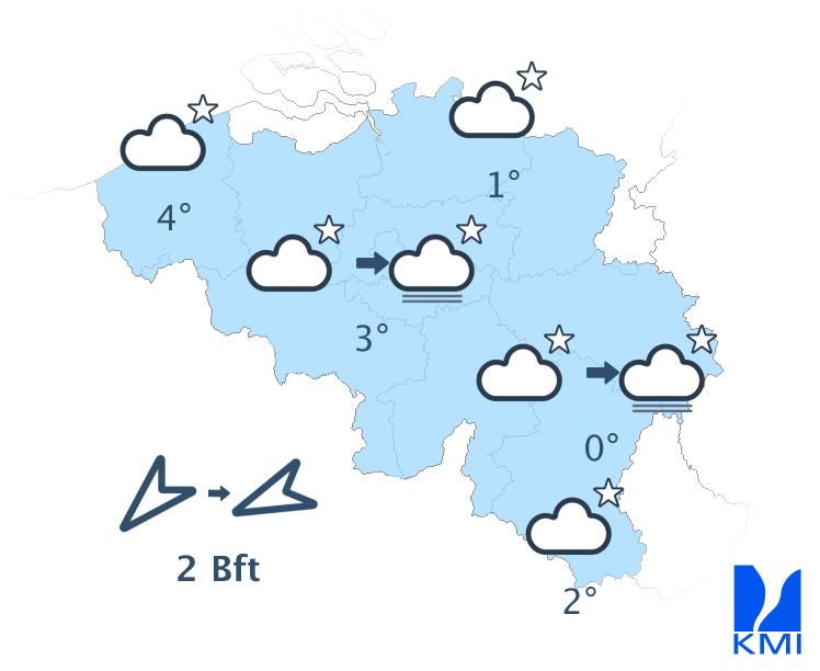 Vannacht wordt het lichtbewolkt of helder. Later vannacht kan er wat nevel of een lokale mistbank gevormd worden. De minima schommelen tussen -1 graden in de Ardennen en +4 graden in Vlaanderen. Zeer lokaal kan het kwik in bepaalde Ardense valleien echter dalen tot ongeveer -5 graden. De oosten- tot noordoostenwind is soms matig in de Ardennen en aan zee en zwak elders.