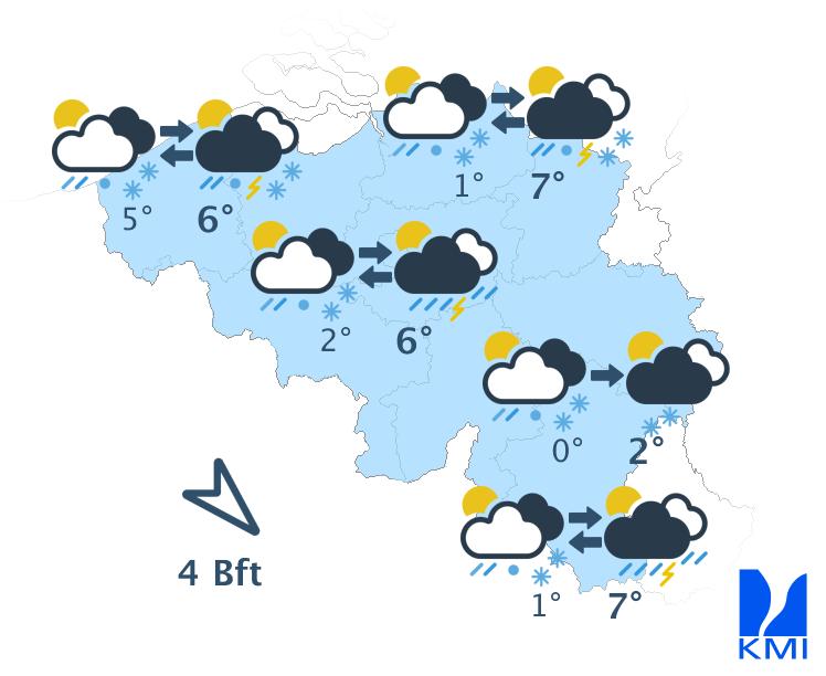 Woensdag is het wisselend tot vaak zwaarbewolkt met regen en buien. De buien kunnen vergezeld zijn van korrelhagel en een donderslag. In de Ardennen kan er winterse neerslag vallen met 's avonds en 's nachts mogelijk vorming van een sneeuwlaag. Het wordt frisser met nog maxima tussen 4 en 9 graden bij een matige tot soms vrij krachtige en aan zee vrij krachtige tot krachtige wind uit het westen tot noordwesten. Rukwinden van meer dan 60 km/u zijn mogelijk.